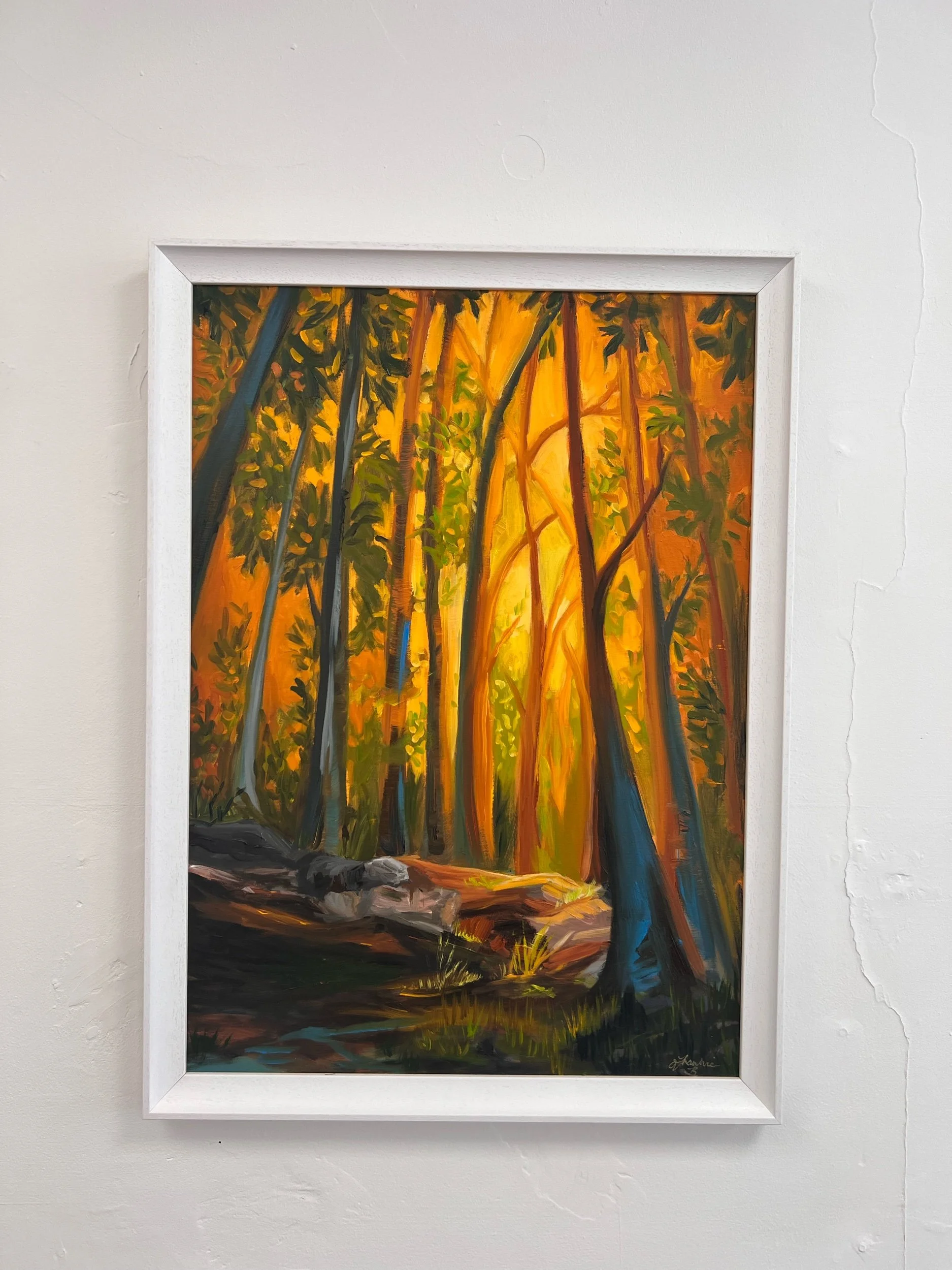 Painted in warm amber tones, Glowing Through the Trees captures sunlight filtering through tall trunks and glimmering across forest floor.