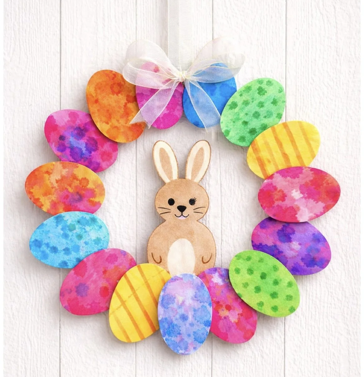 Design and build a colourful Easter wreath using paint, yarn, flowers, eggs and fun textures.