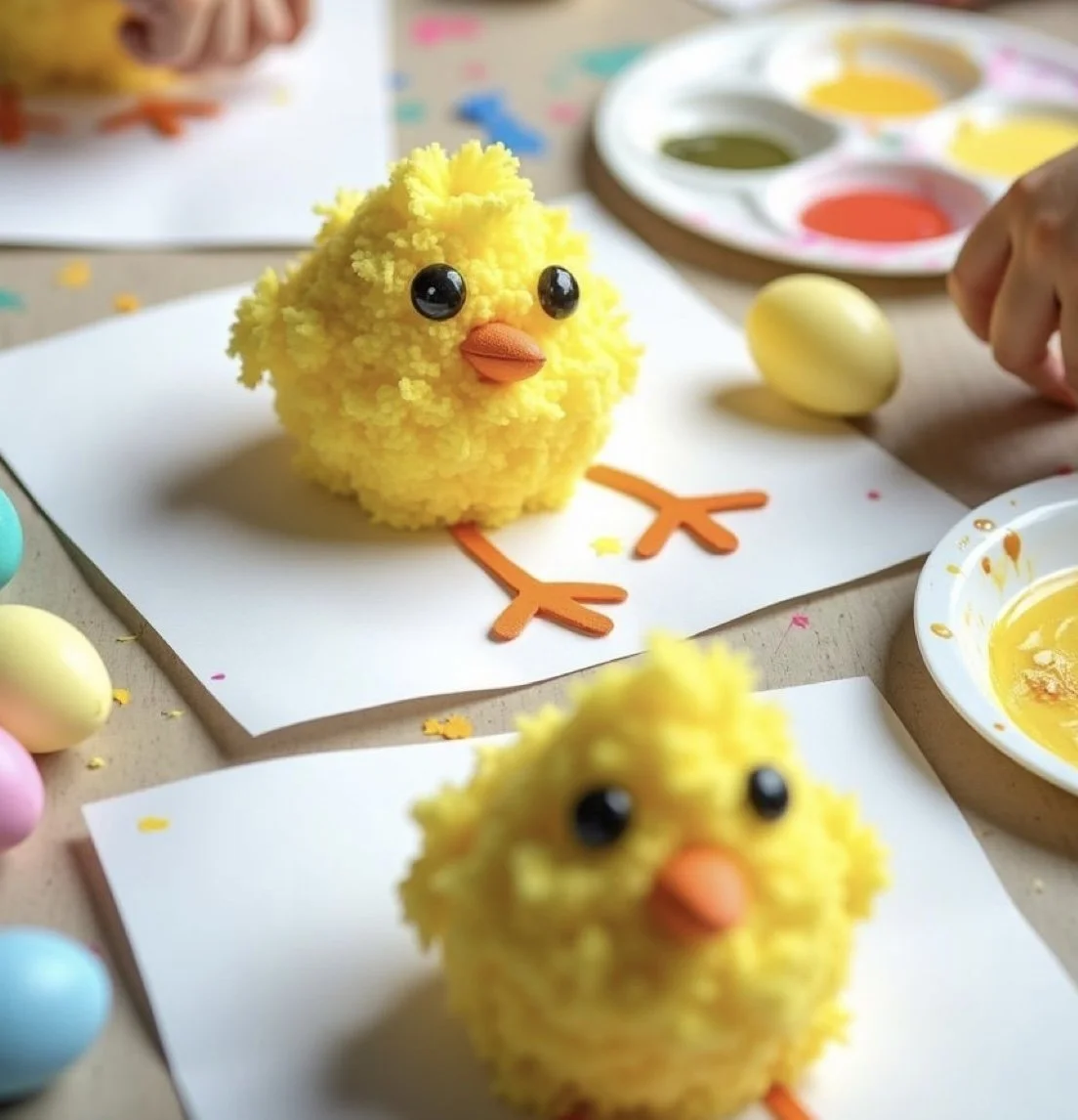 Create a cute, fluffy 3D chick using mixed materials like pom poms, feathers and card.
